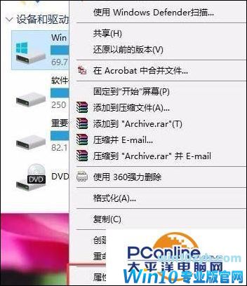 接下来,请大家双击打开Win10系统中的计算机页面,打开计算机系统中的磁盘文件管理页面,对着需要清理的磁盘击右键,选择“属性”选项。