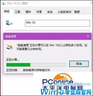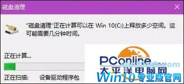 接下来,我们将打开Win10系统磁盘清理页面,在步入下一个阶段之前,要经过一段时间的扫描,扫描视硬盘的读写速度来确定,如果是固态硬盘的话,扫描速度会很快,如果硬盘中文件本身不多的话,速度也是很快的。