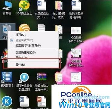 首先,请大家在Win10系统桌面上对着回收站击右键,在弹出的菜单中点击选择“属性”按钮,打开回收站属性页面。