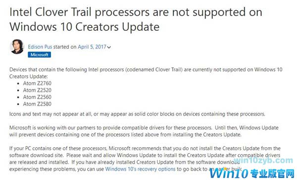 不过,微软已经给出警告,Intel Clover Trail家族的处理器暂时不支持Windows 10创意者更新,万勿升级,涉及的型号有:Atom Z2760、Atom Z2520、Atom Z2560、Atom Z2580。