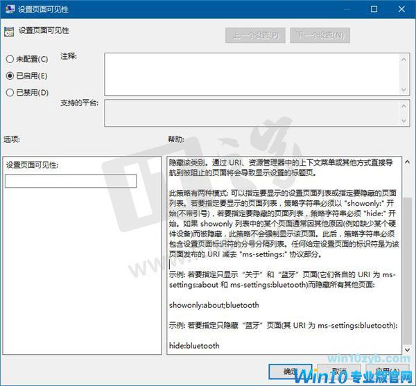 示例:若要指定只隐藏“蓝牙”页面(其URI为ms-settings:bluetooth):