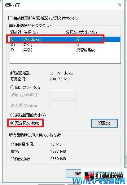 设置步骤: 系统属性—高级系统设置—高级—性能设置—高级—虚拟内存(更改)-将C盘设置成无分页文件,再将其他盘如E盘设置成系统管理的大小。