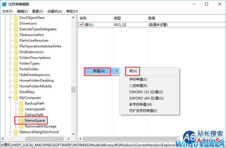5、64位Win10用户还需要定位到:HKEY_LOCAL_MACHINE\SOFTWARE\Wow6432Node\Microsoft\Windows\CurrentVersion\Explorer\MyComputer\NameSpace,新建项,命名为{5399E694-6CE5-4D6C-8FCE-1D8870FDCBA0}。
