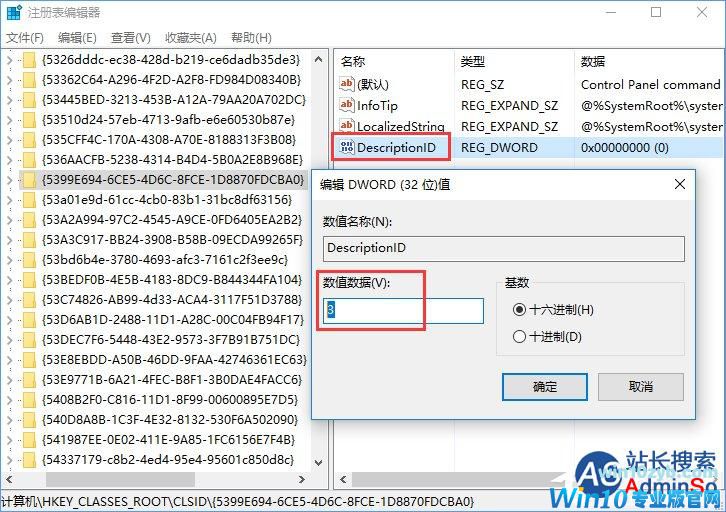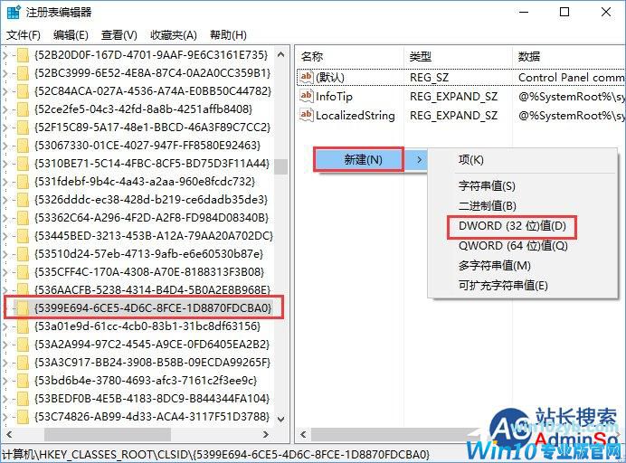 2、定位到:HKEY_CLASSES_ROOT\CLSID\{5399E694-6CE5-4D6C-8FCE-1D8870FDCBA0},新建DWORD(32位)值,命名为DescriptionID,数值数据设置为3。