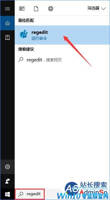 1、在Cortana搜索栏输入regedit,按回车键进入注册表编辑器。