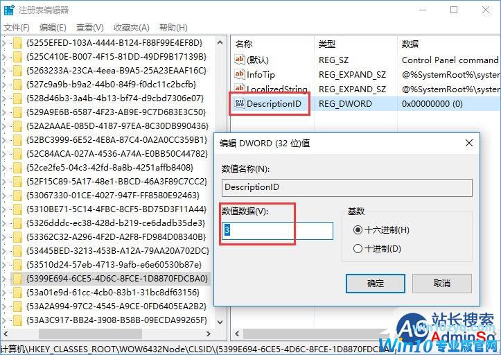 3、64位Win10用户还需要定位到如下位置:HKEY_CLASSES_ROOT\Wow6432Node\CLSID\{5399E694-6CE5-4D6C-8FCE-1D8870FDCBA0},然后新建DWORD(32位)值,命名为DescriptionID,数值数据设置为3。
