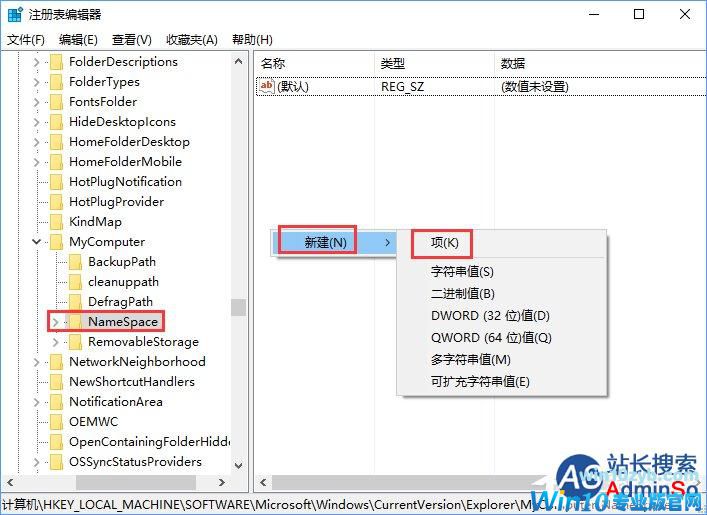 4、再定位到:HKEY_LOCAL_MACHINE\SOFTWARE\Microsoft\Windows\CurrentVersion\Explorer\MyComputer\NameSpace,新建项,命名为{5399E694-6CE5-4D6C-8FCE-1D8870FDCBA0}。