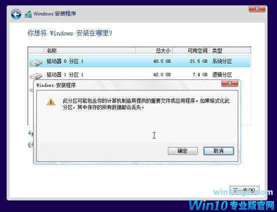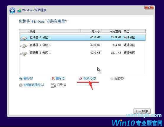 5、选择要安装Win 10的分区。如果目标分区已有系统,可以点击"格式化"格式化目标分区;如果是全新未分区的硬盘,可以点击"新建"创建分区。