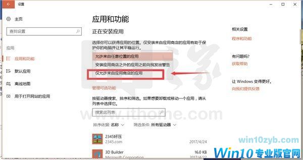其次,为了避免老年人一个不小心安装全家桶,所以我们需要在搞定一切之后限制一下允许安装软件的方式(创意者系统才有的,之前的Windows10没有)。创意者用户请前往设置——应用——在“正在安装应用”一栏选择“仅允许来自应用商店的应用”。