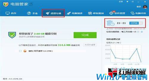 清除垃圾:在使用电脑时,必然会产生一定的垃圾,有系统垃圾和文件垃圾,这些垃圾我们都可以在杀毒软件中清除。在电脑管家中,我们还可以选择【扫一扫】功能,让软件定期给你清除这些垃圾,保障的电脑运行速度!