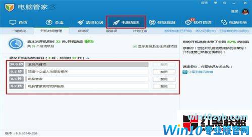 开机加速:首先我们先解决开机速度,打开杀毒软件-电脑加速,查看开机启动项里是否有不必要的启动程序,我们把非必要的启动项禁止掉。
