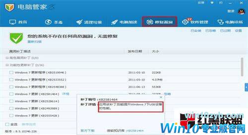 修复漏洞:定期检查并修复漏洞,在杀毒软件中,我们找到修复漏洞项,扫描电脑是否存在漏洞,如果没有漏洞,也可以更新一些系统补丁去解决系统有损坏的问题,可以点击补丁的详情了解补丁的用处,有选择性去更新。