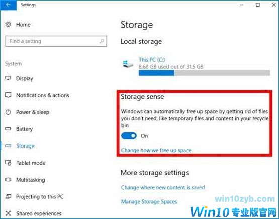 StorageSense功能的主要用途就是让系统自动监控硬盘的空间使用,并主动清理多余的垃圾文件。
