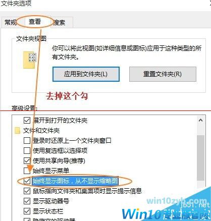 2、正常情况下,在“查看”--->“选项”--->“更改文件夹和搜索选项”--->“查看”--->“高级设置”--->把“始终显示图标,从不显示缩略图”前面的勾去年即可。