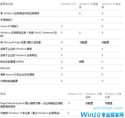 S版具体与HOME和Pro版本差异在哪里,下面一张图基本上可以解答这一问题(X代表默认支持):