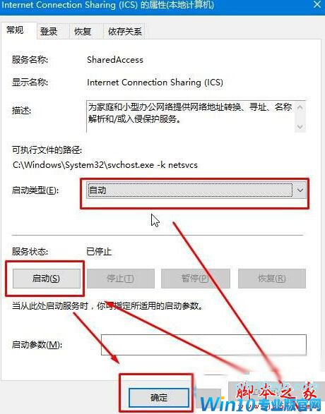 4、在右侧双击打开【Internet Connection Sharing(ICS)】项,将其启动方式修改为“自动”点击【应用】,点击【启动】,点击【确定】。