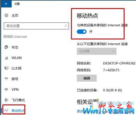 2、点击左侧的【移动热点】,在右侧将【与其他设备共享我的 internet 连接】的开关打开;