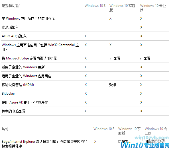 S 版具体与 HOME 和 Pro 版本差异在哪里,下面一张图基本上可以解答这一问题(X 代表默认支持):
