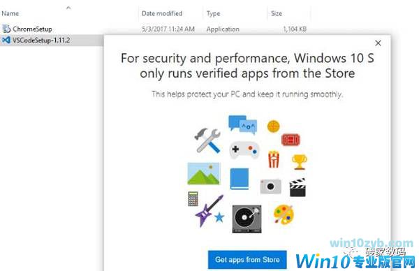 那么可能你会问,当尝试安装Windows Store 商店之外的应用时会如何,目前早期的体验表明,Windows 10 S 系统会弹出提示框“在Windows 10 S 上使用的应用必须来自Windows 应用商店”,再一次告诉用户只能使用Windows 商店的应用。在某些情况下,系统还会自动跳转显示关于已在Windows 应用商店中提供的某类相似应用,或者某种特定应用的建议。