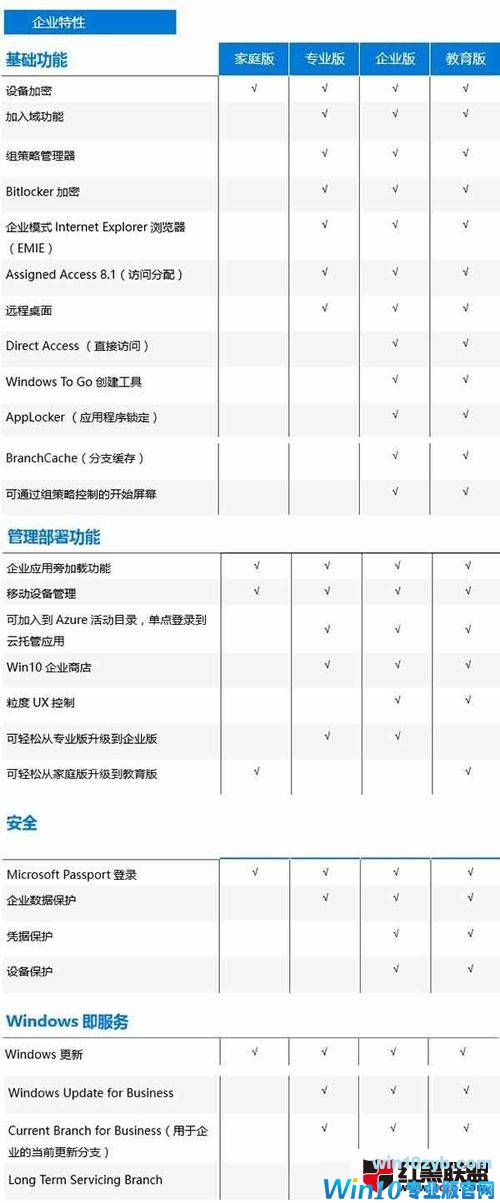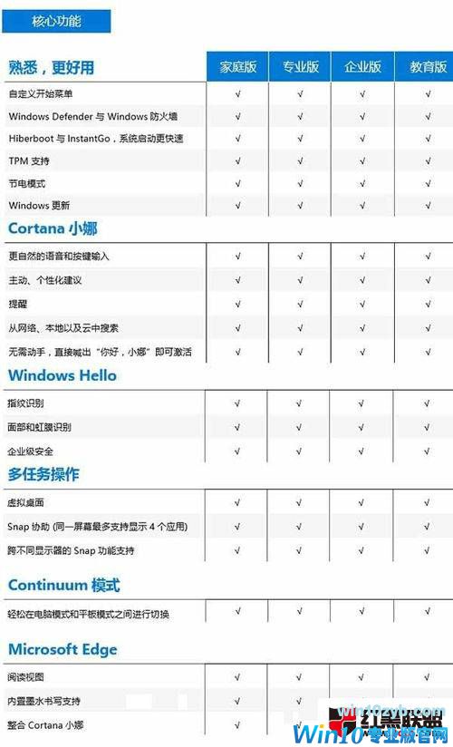 现在我们先来了解一下各版本的区别。下图是win10各版本的核心功能对照表。