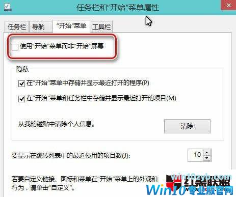 切换至“开始菜单”标签;取消勾选“使用‘开始’菜单而非‘开始’屏幕”