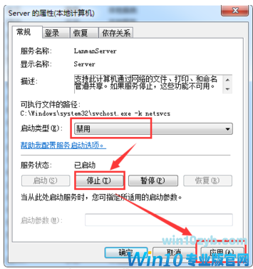 然后,找到server服务,双击进入管理控制页面。把这个服务的启动类型更改为“禁用”,服务状态更改为“停止”,最后点击应用即可。