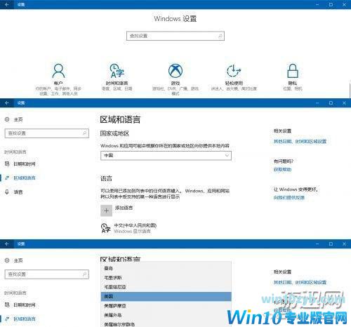 1. 进入【设置】>【时间和语言】>【区域和语言】,可通过国家和地区的下拉菜单进行设置。