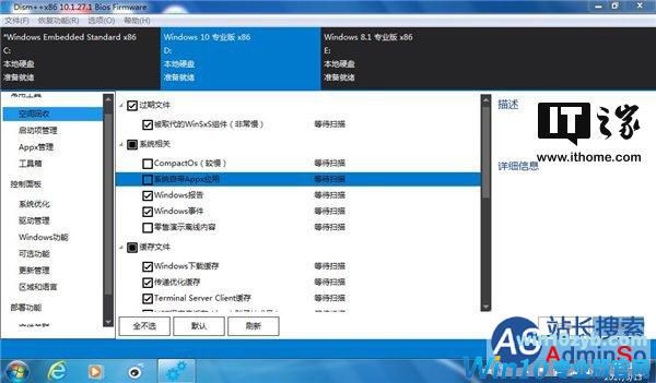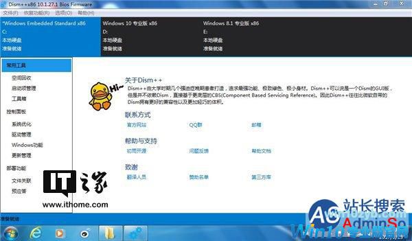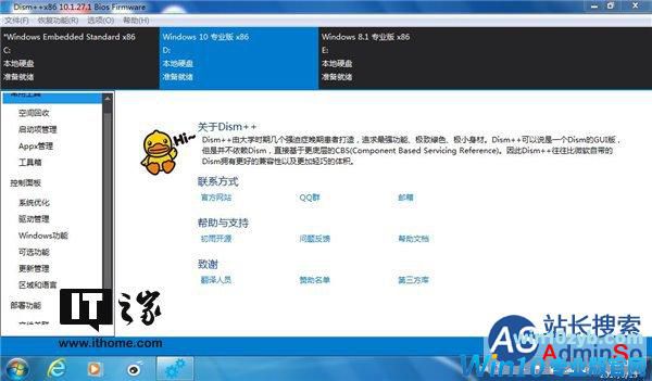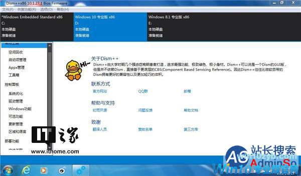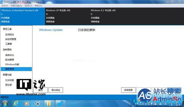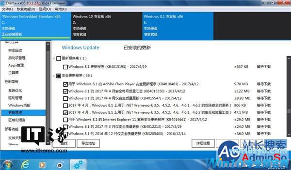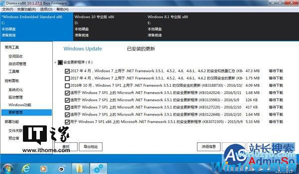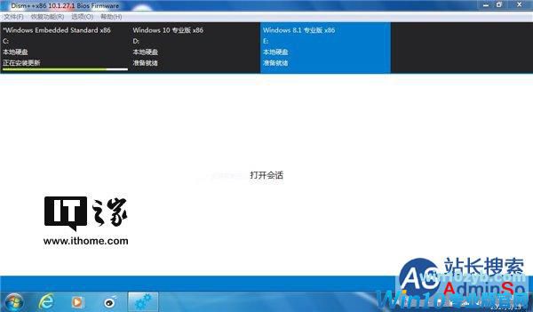 打开Dism++,上面就列出了你电脑上安装的系统列表。我这里演示的电脑装了Win7/Win8.1/Win10三系统,正好可以展示更新当前系统和非当前系统的方法。