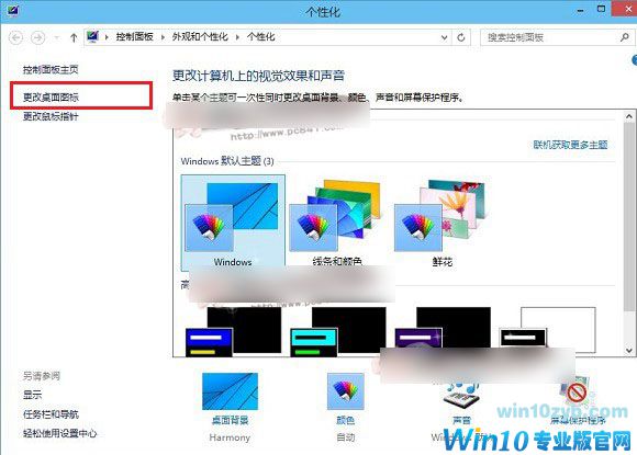 二、进入Win10桌面个性化设置后,再点击侧面的“更改桌面图标”,如下界面图所示。