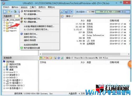 打开WIN10的ISO文件以后再点击”启动“然后选择”写入硬盘映像“
