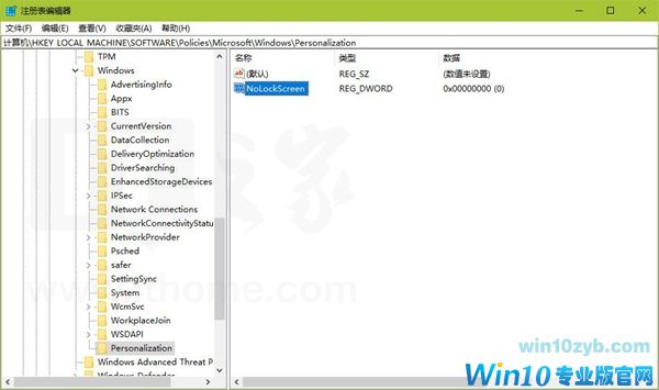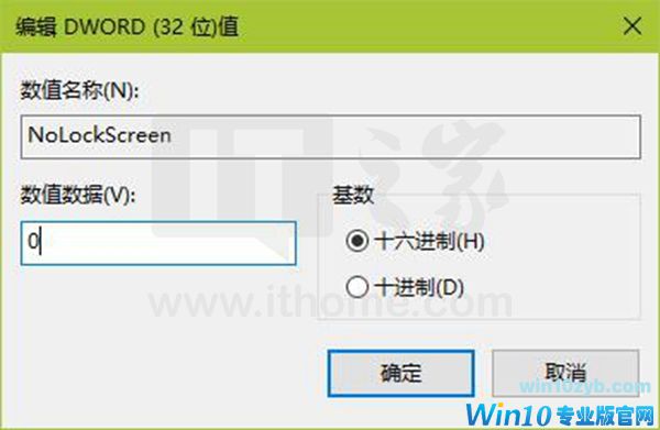 双击DWORD(32位)值NoLockScreen,将数值数据下的输入框中的数字设置为0。