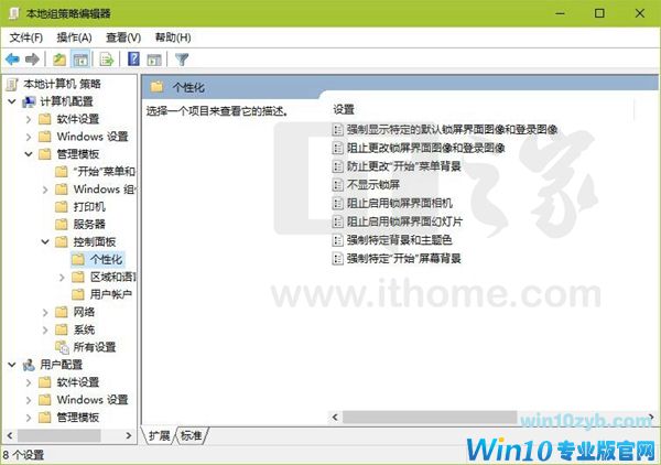 通过左侧的树形导航进入计算机配置-管理模板-控制面板-个性化;