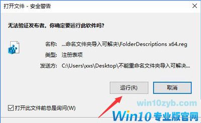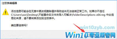 3、此时我们可以看到2个注册表文件,如果你的系统是win10 64位的,双击运行FolderDescriptions x64.reg,如果似乎win10 32位系统,则双击运行FolderDescriptions x86.reg,在弹出的框中点击“是”即可。