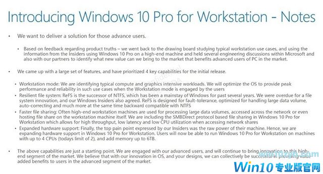 接连宣布推出Windows 10 Creators,以及Windows 10 Creators秋季版更新后,微软接下来似乎计画针对企业端使用的Windows 10 Pro添加新功能,其中包含对应ReFS档案格式、SMBDirect传输协定,同时也提供更高硬体扩展设计,借此对应高阶工作站电脑等使用需求。