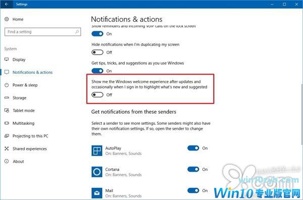 4.在“通知”下,关闭显示Windows欢迎体验界面,这个当更新后或偶尔在登录时突出显示的建议切换开关。