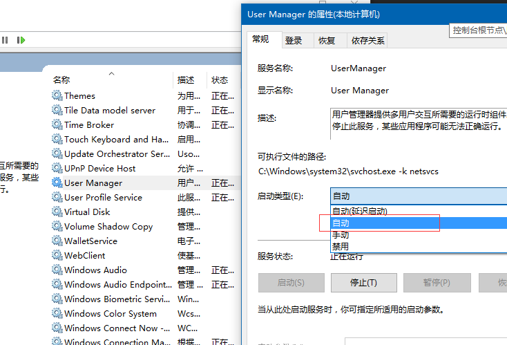 3、将启动类型改为“自动”,点击应用,确定之后注销或重启电脑即可。