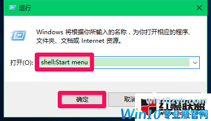 在运行对话框中输入:shell:Start menu(当前用户有效)或shell:Common Start menu(所有用户有效)命令,点击确定或者回车,打开系统程序窗口;