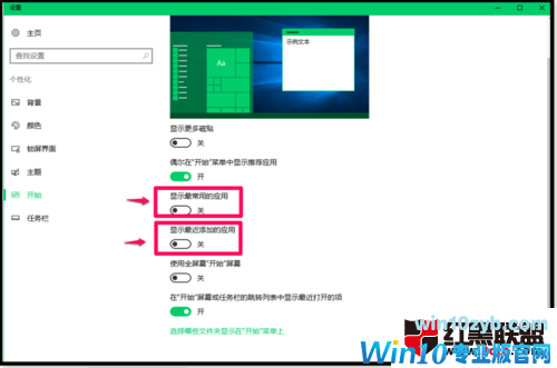 方法二:在开始菜单设置中关闭【显示最常用的应用】和【显示最近添加的应用】,使开关处于【关】的位置就可以了。