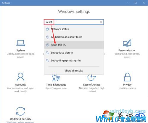 3、在弹出的设置中,我们在搜索里面输入“reset”或者“重置”(对应英文版,中文版系统)。