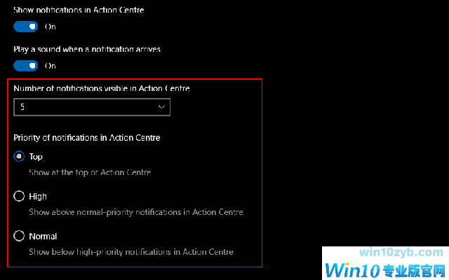 最后一个选项可以让您在Action Center中选择该应用的优先级。 正如标签所示,“顶级”应用程序出现在托盘的最上方,“高”应用程序的提醒接下来,“正常”应用程序被迫停留在底部。 您可以将多个应用程序标记为“高”优先级,但必须为“顶”位置选择一个。