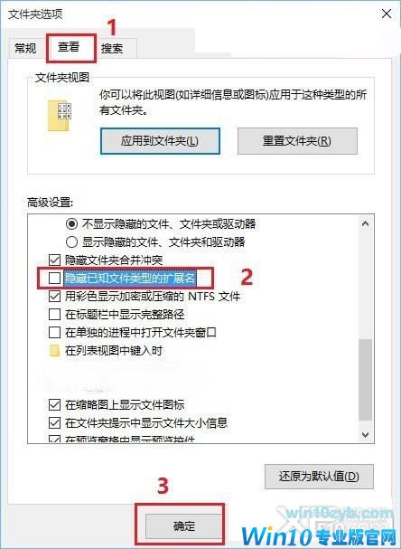 2、在打开的文件夹选项中,再次切换到「查看」,然后在下方的高级设置中找到“隐藏已知文件类型的扩展名”,将其前面的勾去掉,并点击底部的“确定”保存,如图。