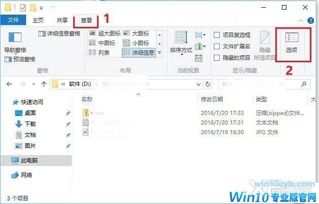 1、首先切换到文件夹的「查看」选项,然后点击「选项」,如图。