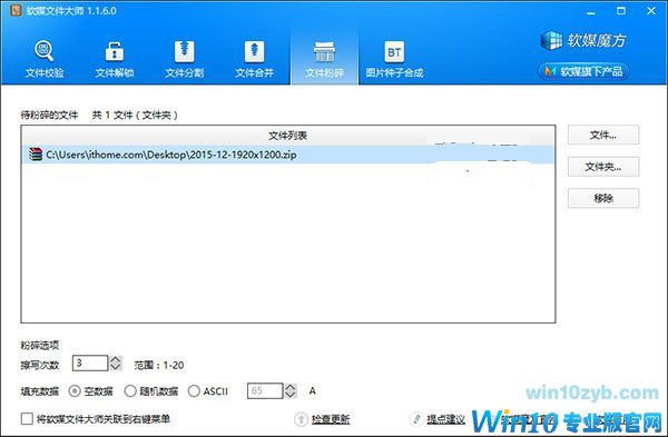 是不是非常简单?另外,如果你的文件还没有被人为删除,可使用软媒魔方中的文件大师对其进行粉碎,文件大师同样会使用随机、空白等数据对文件进行擦写,这在需要对于单个文件进行擦除时效率要更高。如下图所示: