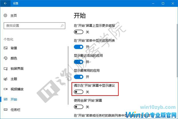Win10可能会在开始菜单中显示一些建议你购买或者安装的应用程序,如果你不高兴看到这些应用建议,那你只需打开设置,来到个性化-开始,将“偶尔在‘开始’屏幕中显示建议”设置为关闭,估计很多人都知道这么做。