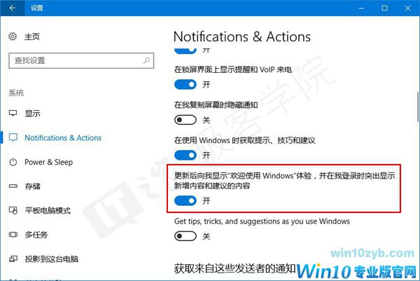 如果你对Win10的新特性已经非常熟悉,不再希望看到类似的页面,那么你只需打开设置,来到系统-通知和操作,将“更新后向我显示‘欢迎使用Windows’体验,并在我登录时突出显示新增内容和建议的内容”设置为关闭。