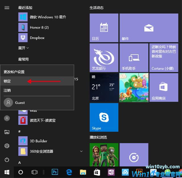点击左下角的开始按钮。单击用户图标,然后选择锁定。