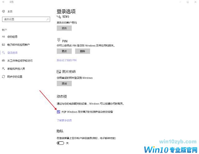 如果你的WIN 10已经更新了创意版本,还可以使用动态锁锁定屏幕,点击开始菜单→选择账号→点击登录选项→打开动态锁。前提是你的电脑有蓝牙功能,通过蓝牙和你的手机配对,当你的手机离开蓝牙覆盖范围1分钟后,电脑将自动锁屏。