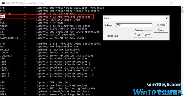 5.Coreinfo将列出处理器信息,并确保PAE,NX,SSE2和CX16存在(您可以使用Ctrl + F键盘快捷方式打开find命令)。 如果四个功能存在,那么您可以升级到Windows 10(x64)。