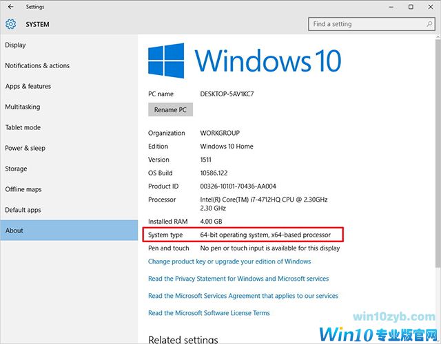 4.在系统类型下,您将看到两条信息:如果说32位操作系统,基于x64的处理器,则表示您的PC在64位处理器上运行32位版本的Windows 10。 如果说32位操作系统,基于x86的处理器,那么你的电脑不支持Windows 10(64位)。
