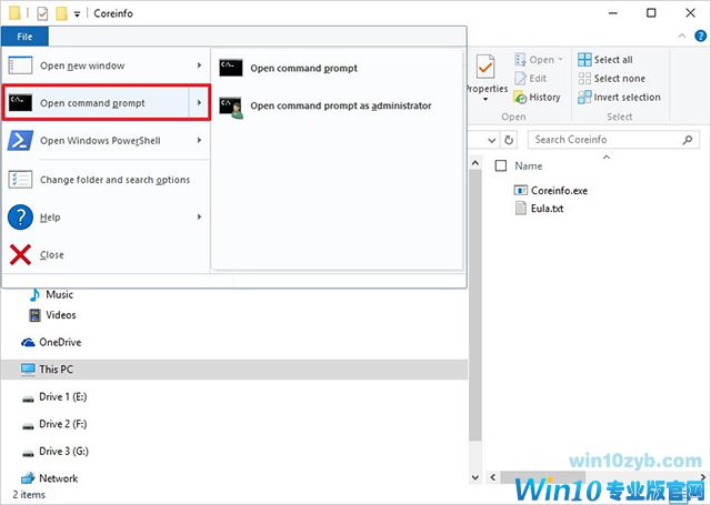 3.Coreinfo文件夹打开后,单击文件,然后选择打开命令提示符。